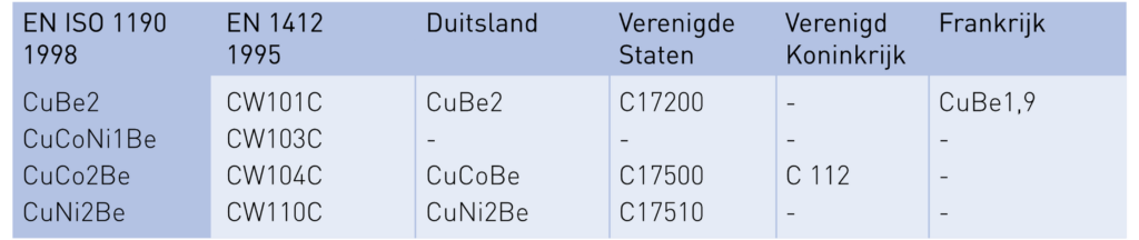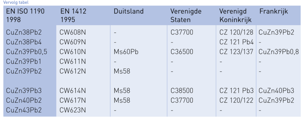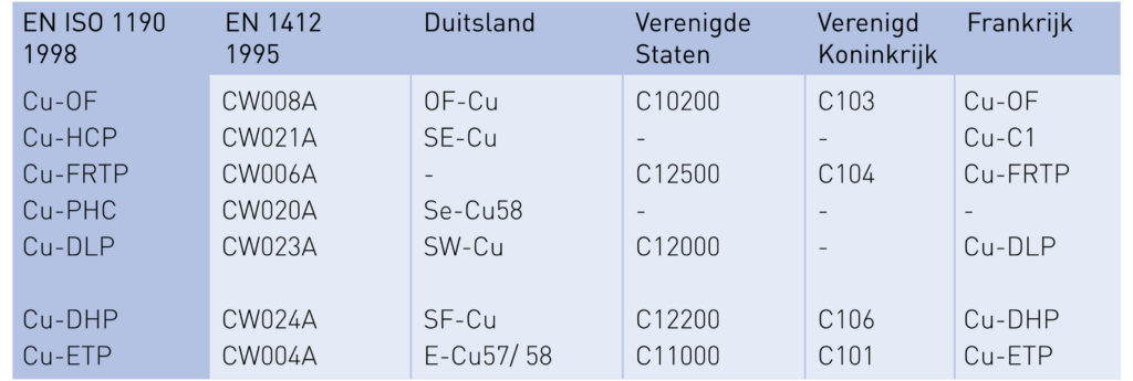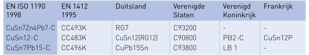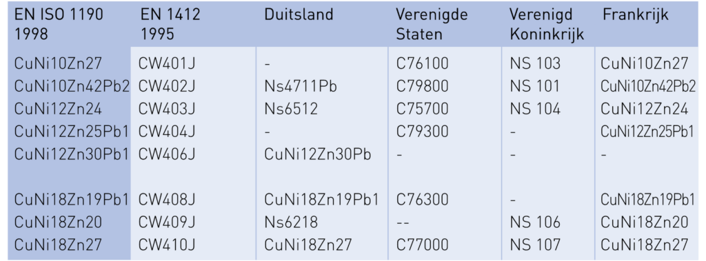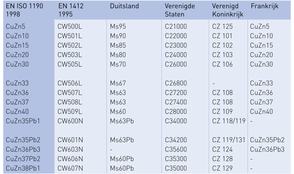 Lijsten met overeenkomstige aanduidingenvan veel voorkomende koperlegeringen