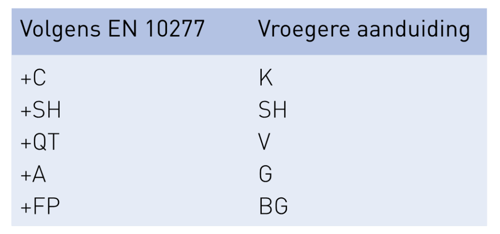 Blank carboneerstaal wordt aangeduid op basis van de chemische samenstelling zoals vastgelegd in EN 10084. Om de leveringstoestand aan te geven worden, afhankelijk van de kwaliteit, de volgende letter(s) gebruikt: