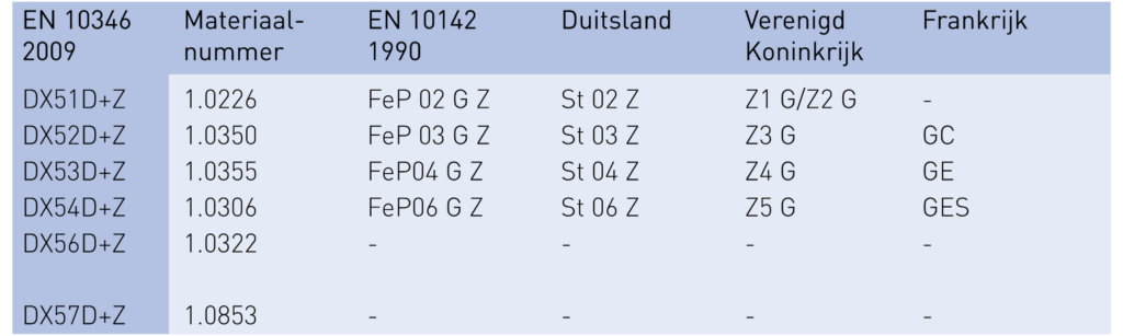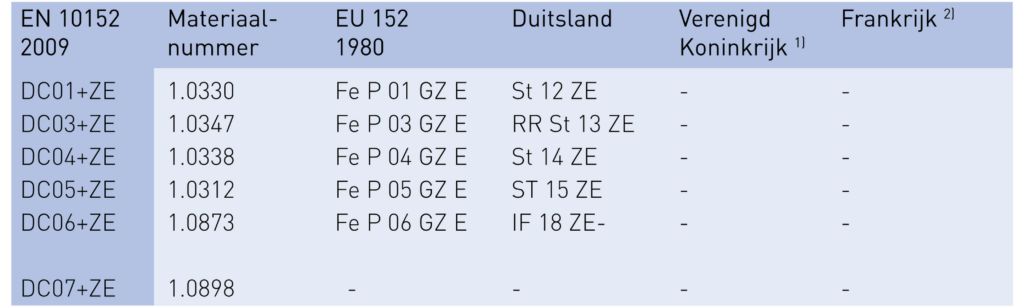 Plaat EN 10152-DC01+ZE25/25-APC: een koudgewalst staal (DC) in een buig- en zetkwaliteit (01), elektrolytisch verzinkt (ZE) met weerszijde een nominale laagdikte van 2,5 µm (25/25) met oppervlaktekwaliteit A, gefosfateerd (P) en chemisch nabehandeld (C).