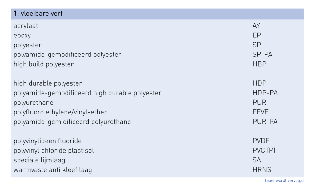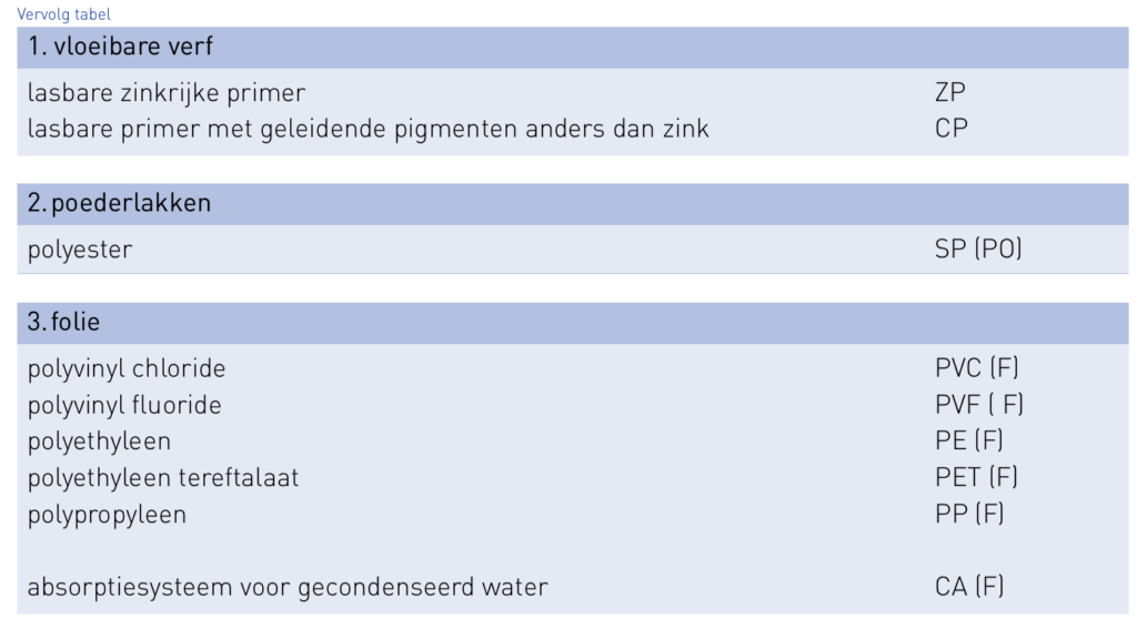 Tabel met aanduidingen voor de meest gebruikte organische deklagen.
