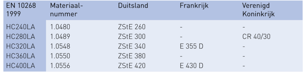 Plaat EN 10268-HC280LA: een koudgewalste plaat met hoge rekgrens voor koudvervormen (H) met een minimale rekgrens van 280 N/mm², microgelegeerd (LA).