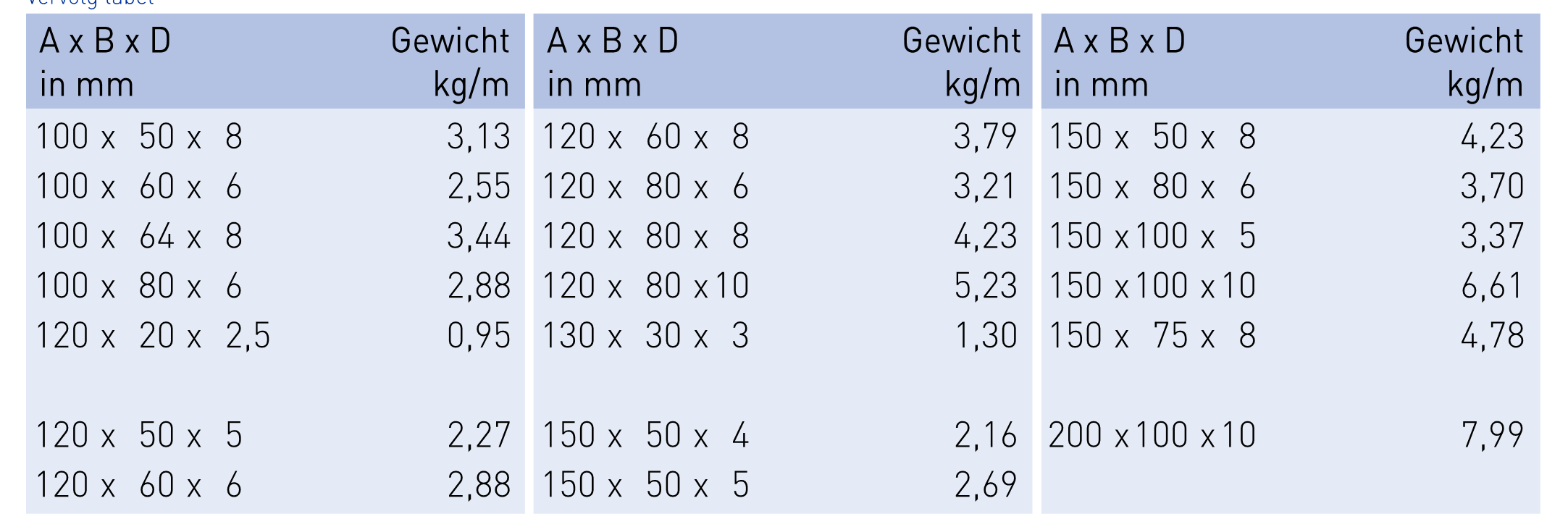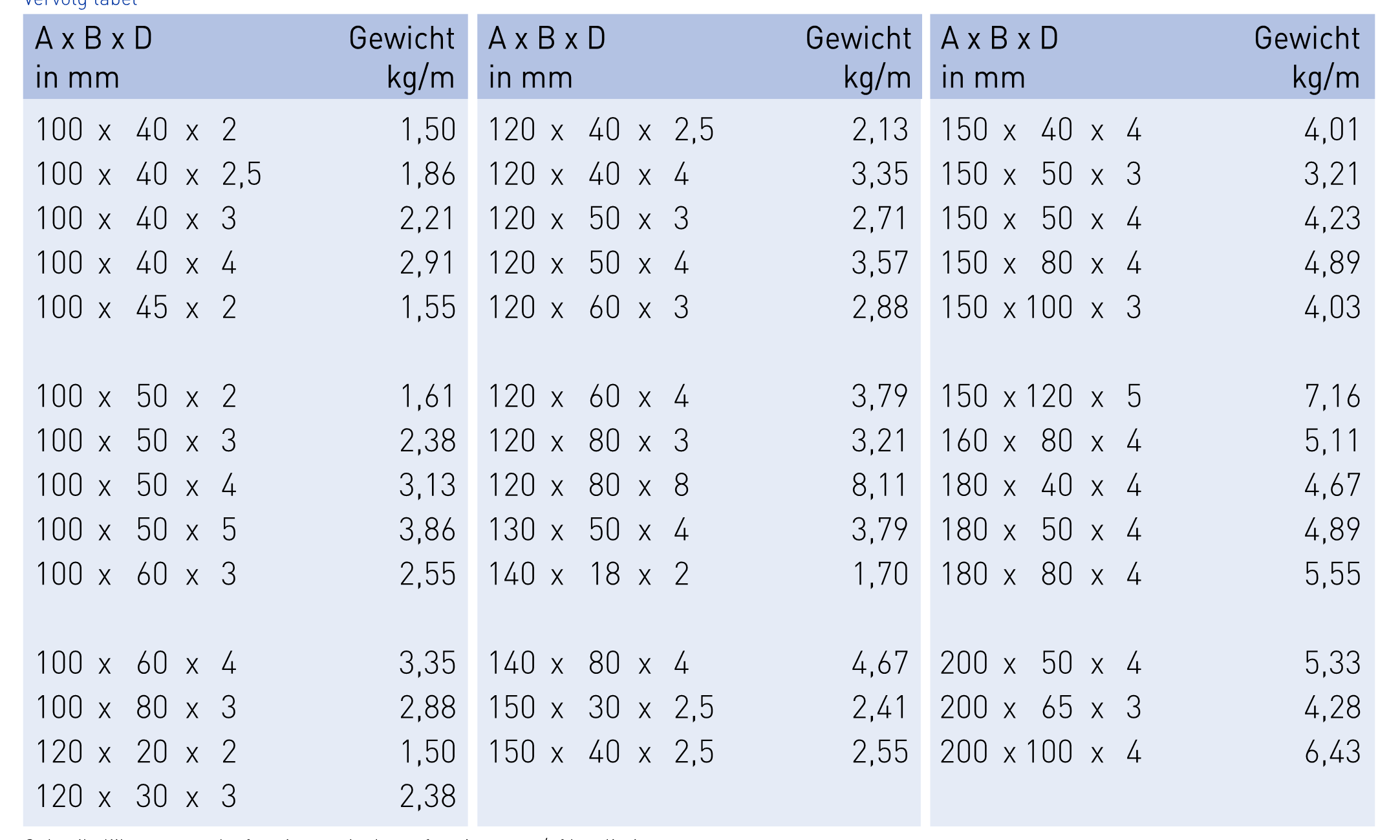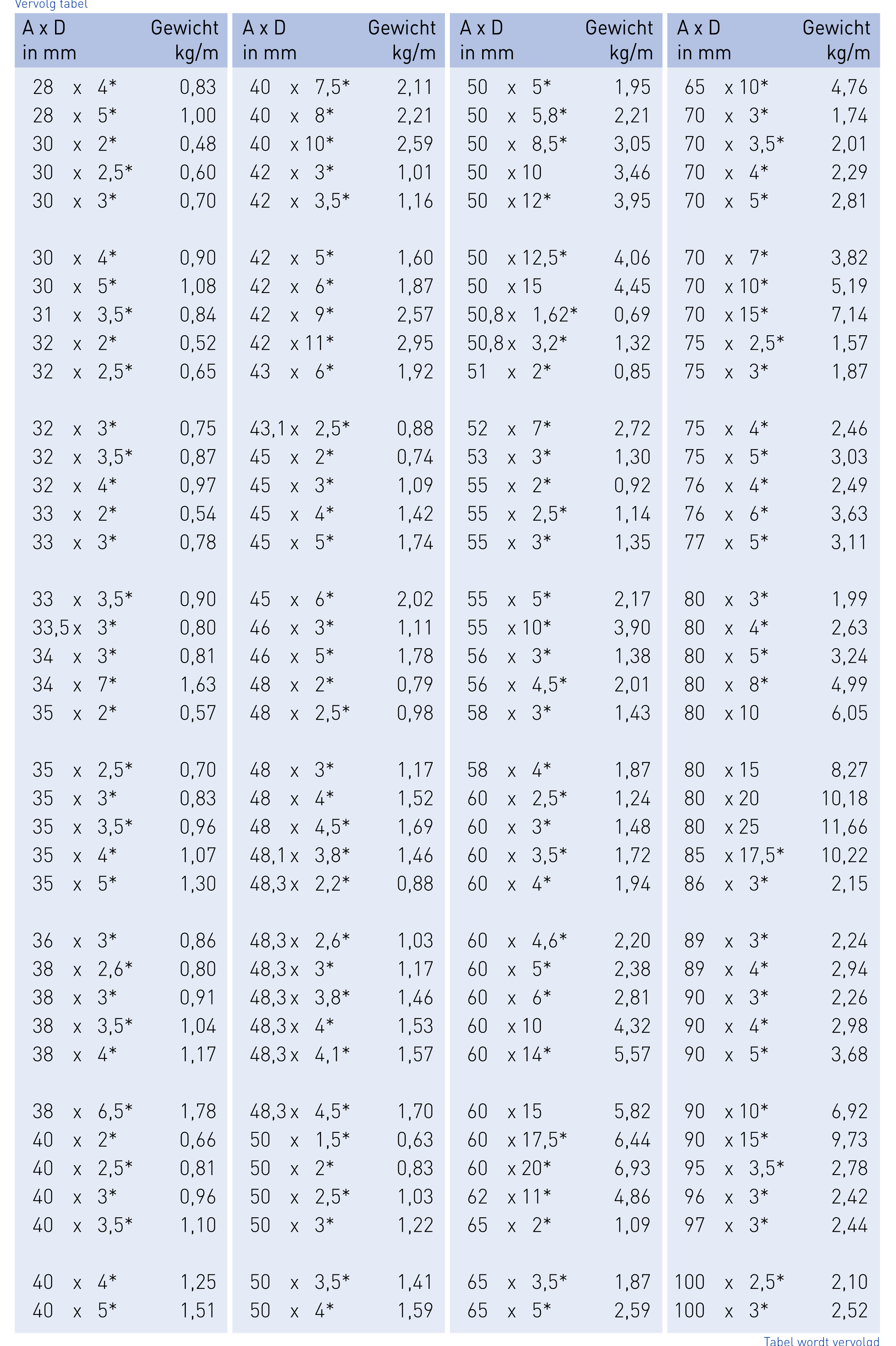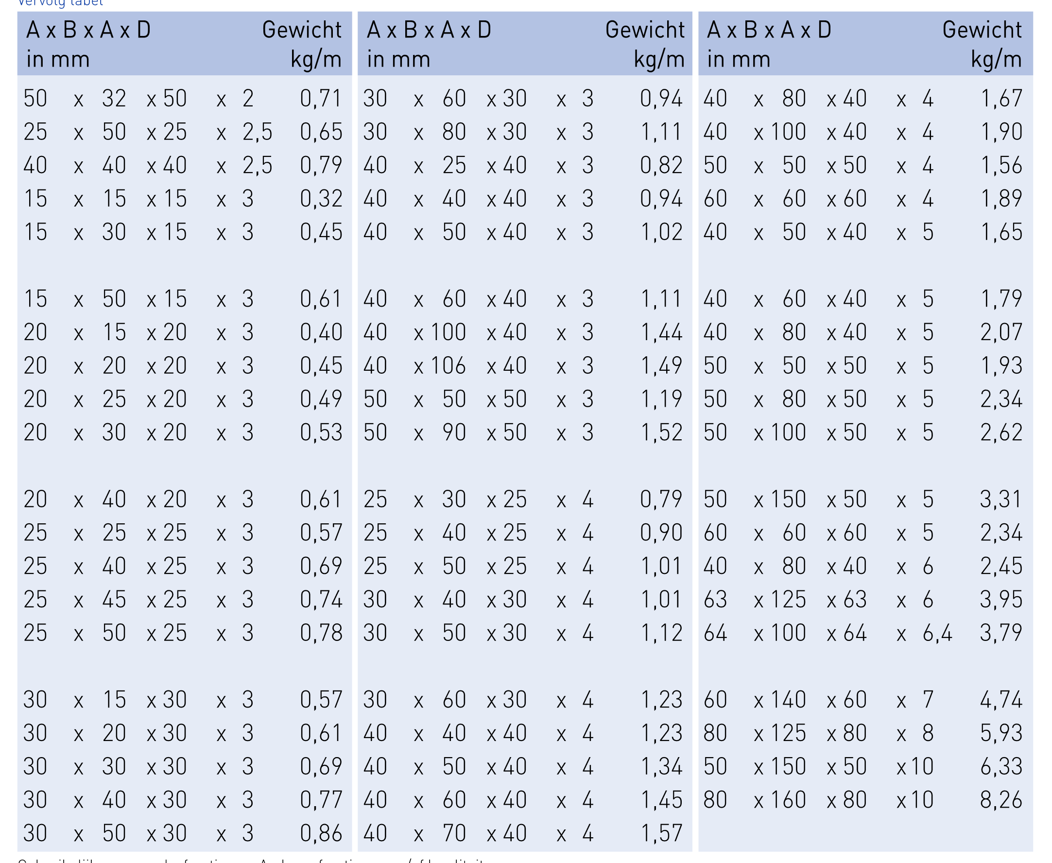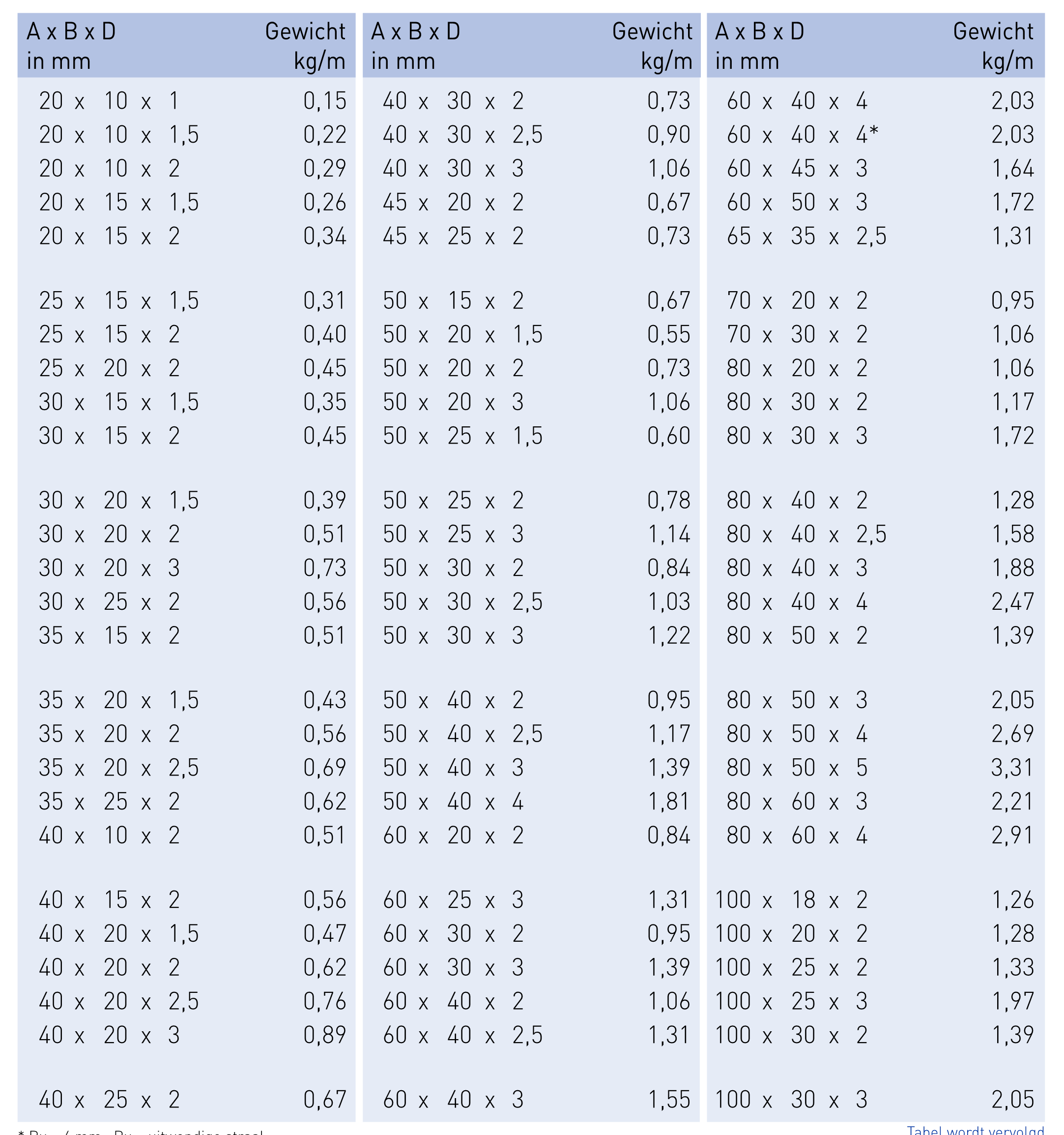 Gebruikelijke voorraadsafmetingen. Andere afmetingen en/of kwaliteiten op aanvraag. * ri = 1 mm / ru = 3 mm ** ri = 0,5 mm / ru = 2 mm *** ru = 3 mm ri = inwendige straal / ru = uitwendige straal