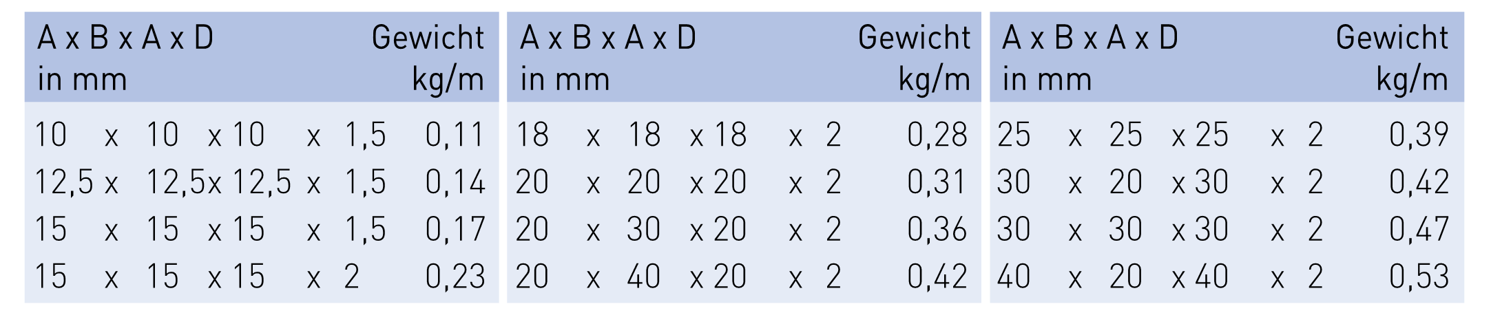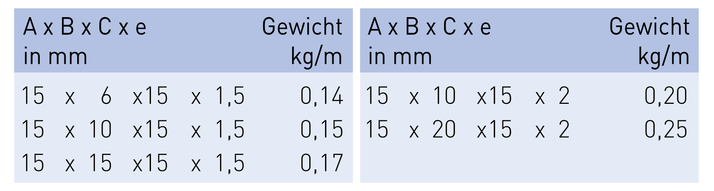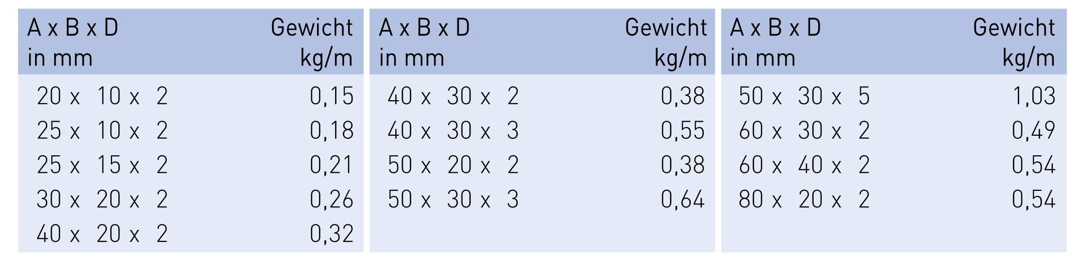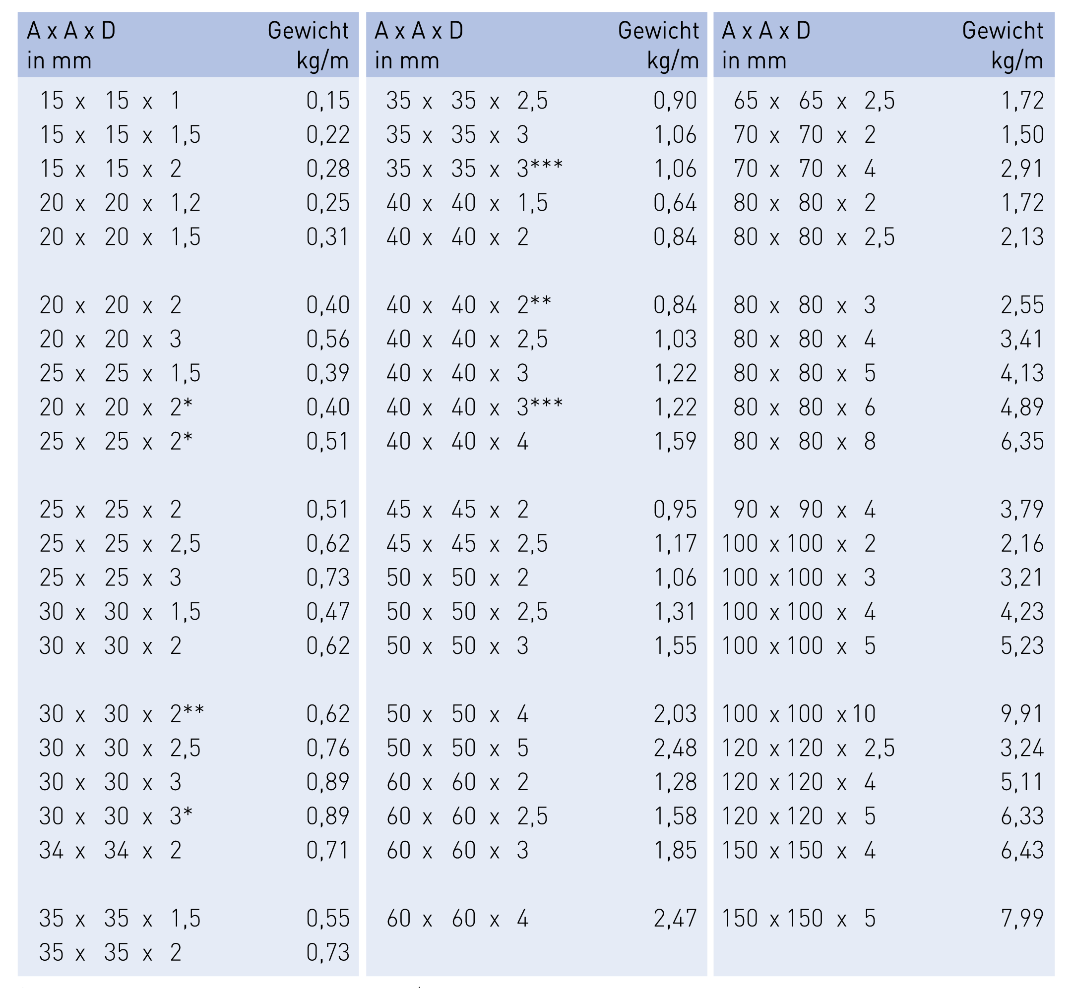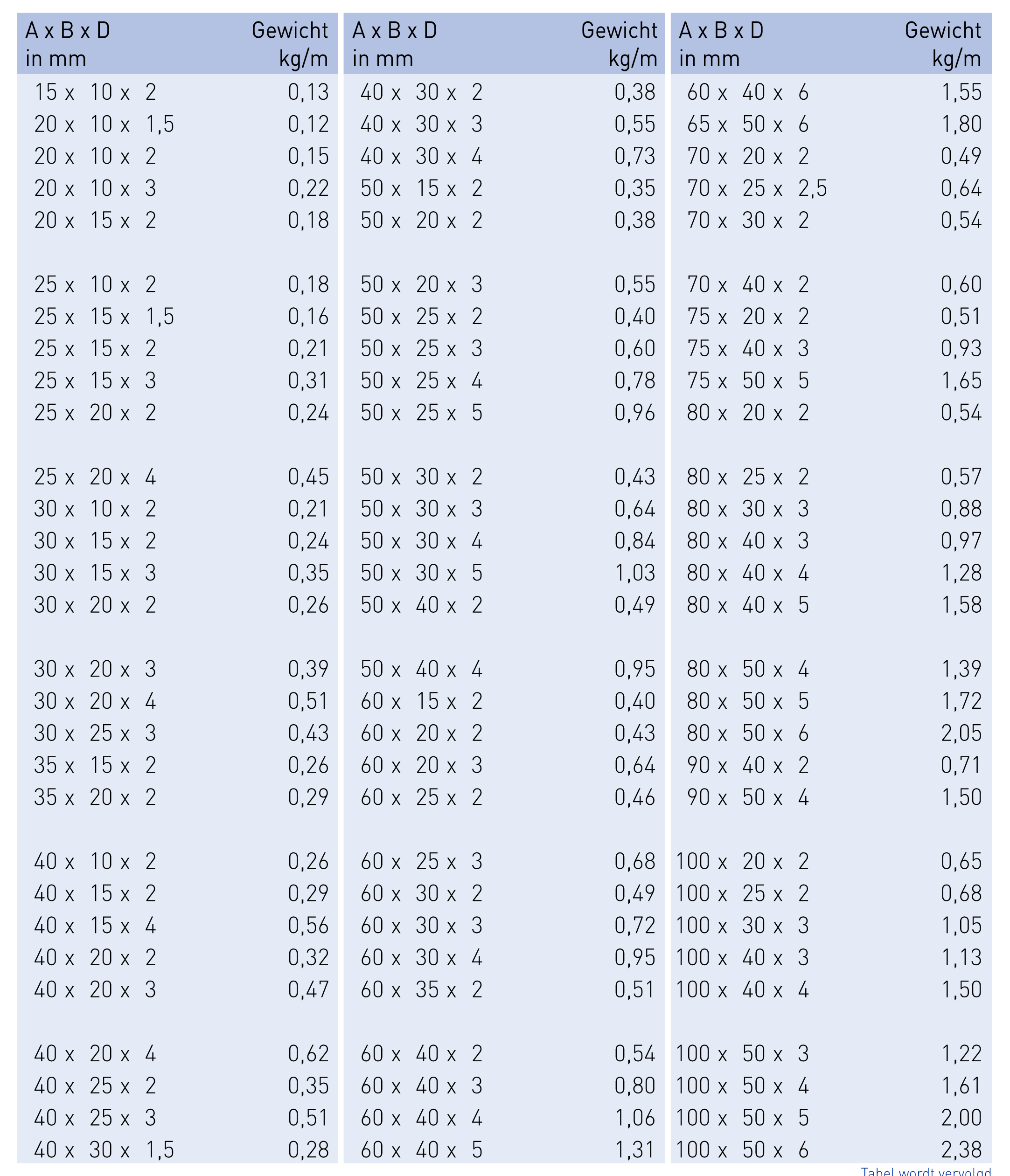 Gebruikelijke voorraadsafmetingen. Andere afmetingen en/of kwaliteiten op aanvraag. * ri = 1 mm / ru = 3 mm ** ri = 0,5 mm / ru = 2 mm *** ru = 3 mm ri = inwendige straal / ru = uitwendige straal