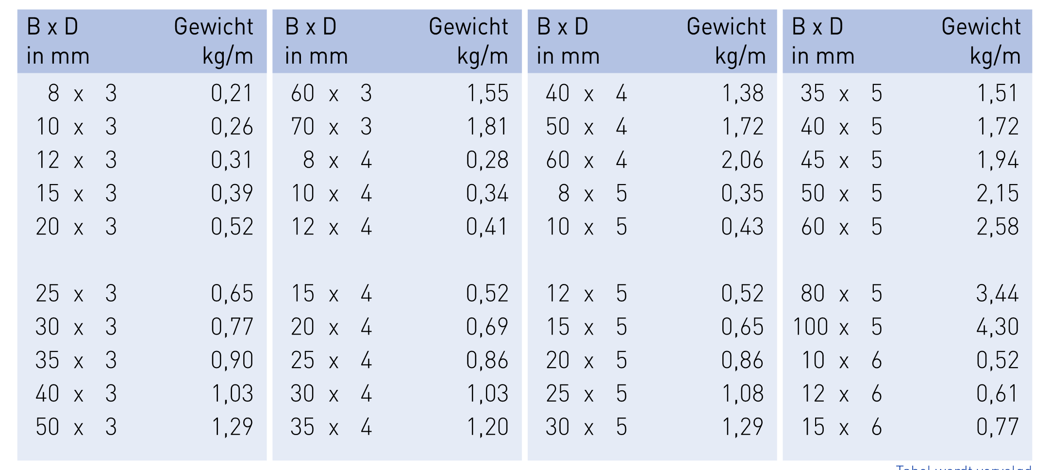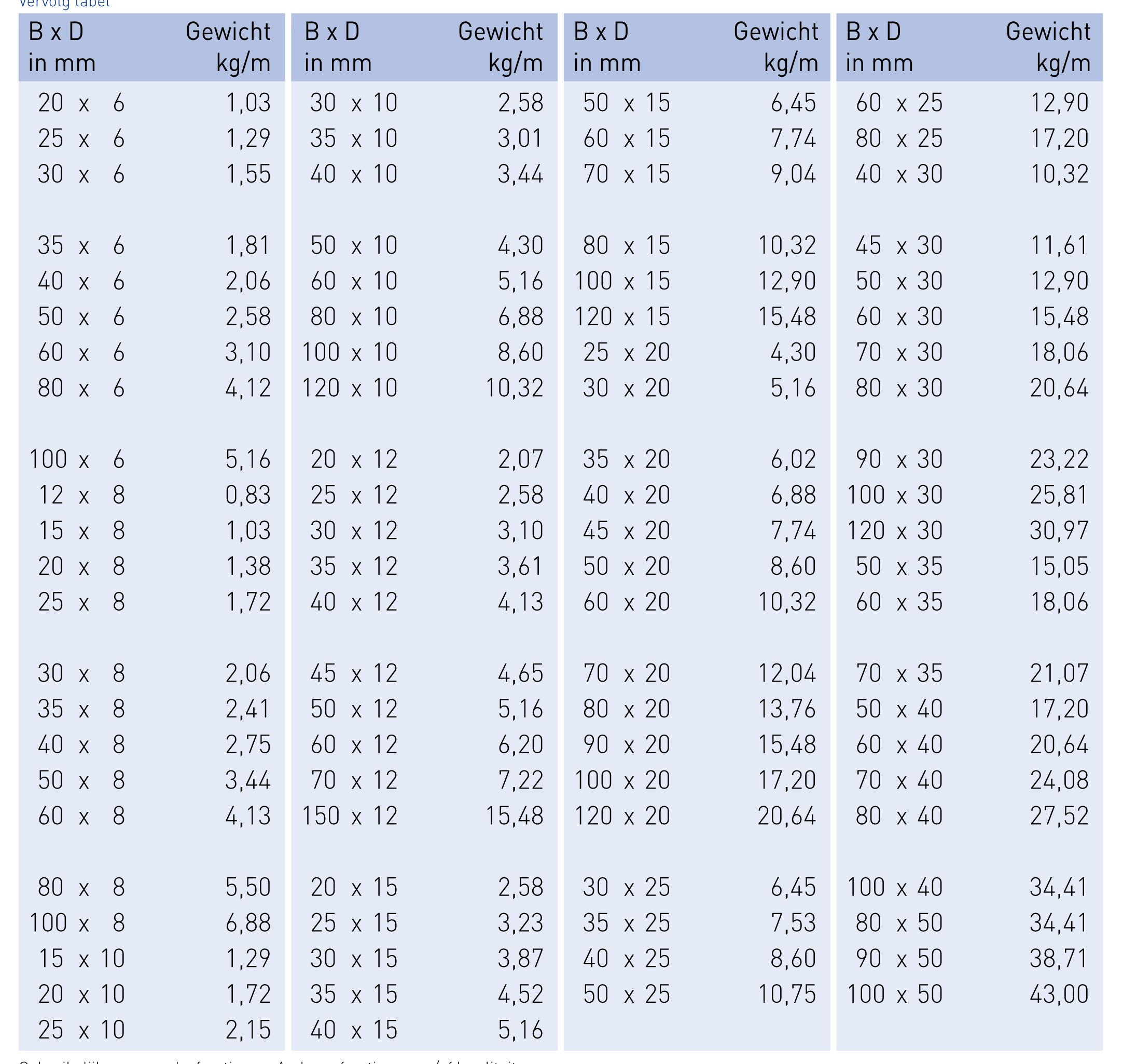Gebruikelijke voorraadsafmetingen. Andere afmetingen en/of kwaliteiten op aanvraag.