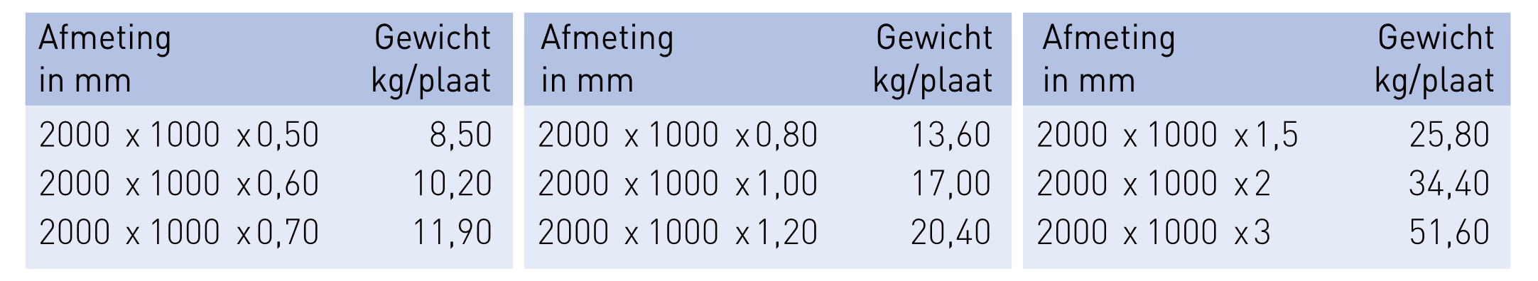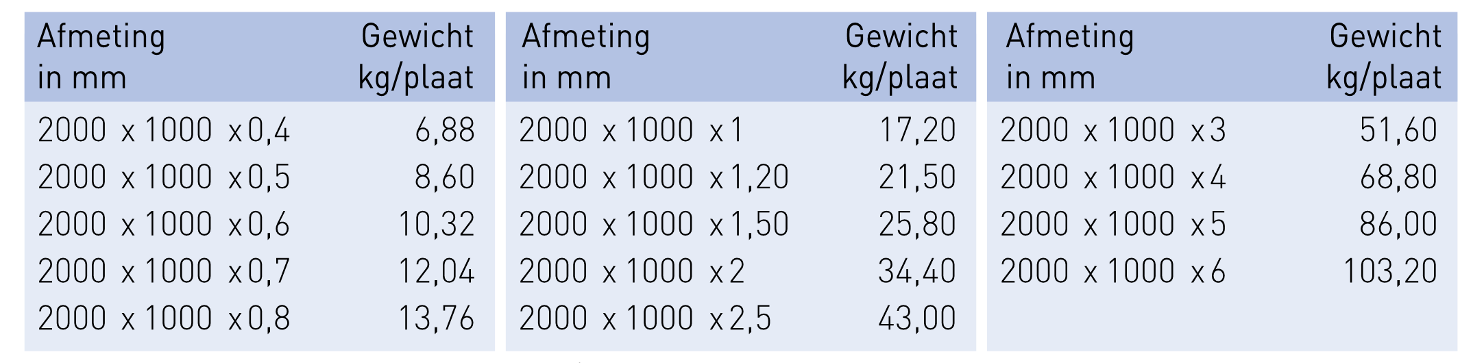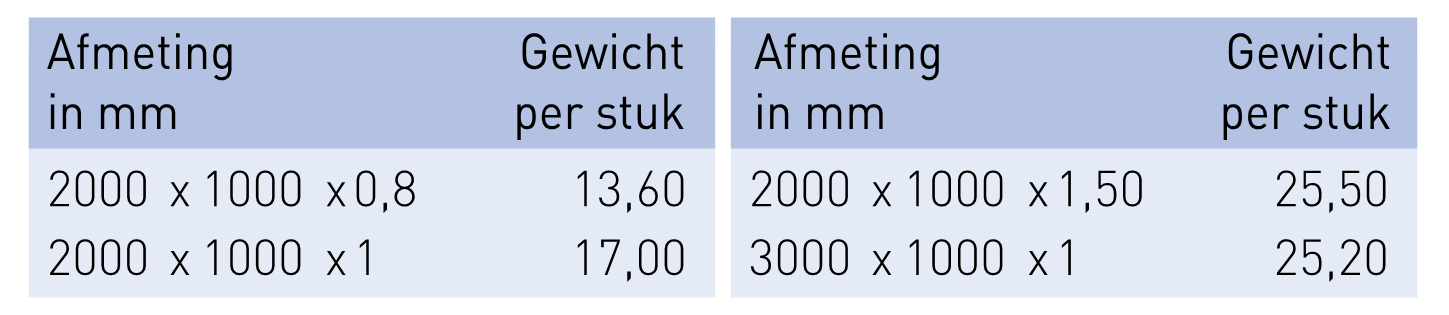 Gebruikelijke voorraadsafmetingen. Andere afmetingen en/of kwaliteiten op aanvraag.