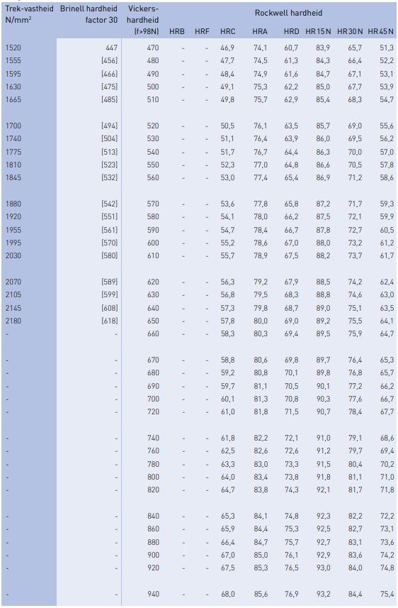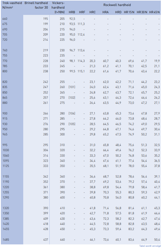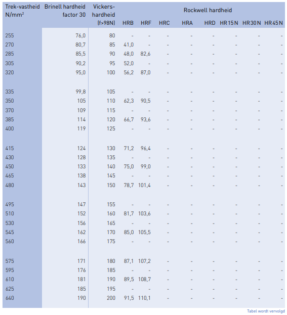 - De Brinell hardheden in de tabel zijn berekend door de Vickers-waarden met de factor 0,95 te vermenigvuldigen.
